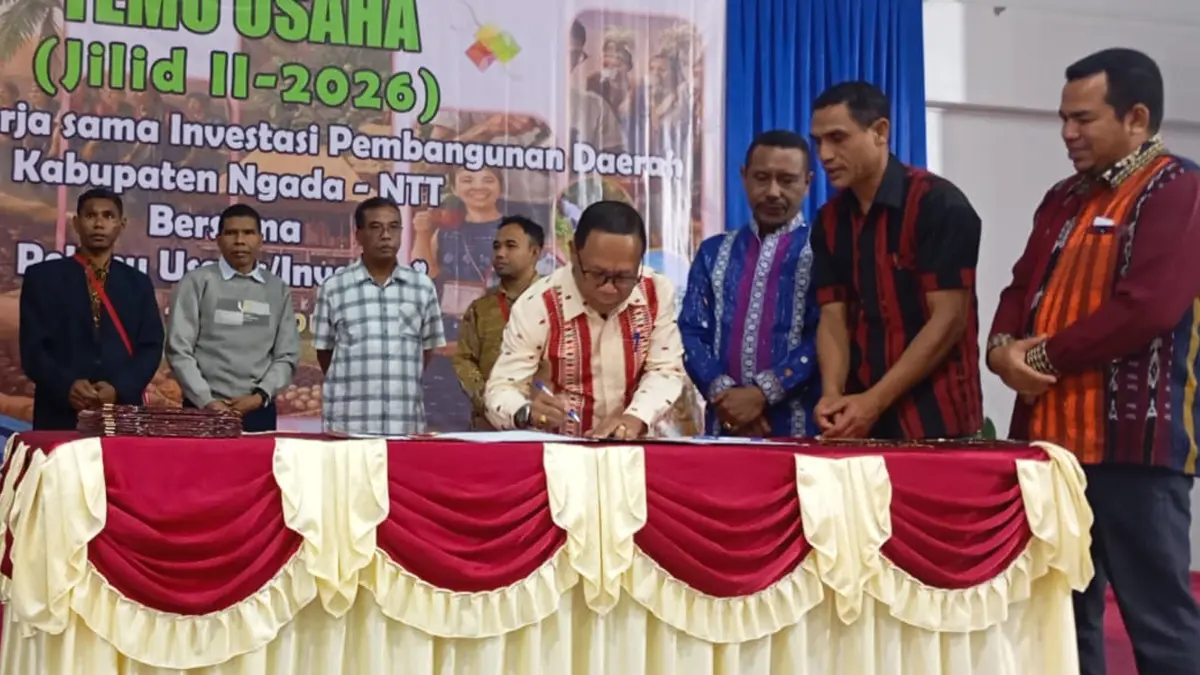 NGADA, GardaFlores — Pemerintah Kabupaten Ngada menandatangani nota kesepahaman (MoU) dengan sekitar 20 investor pada Temu Usaha Jilid II Tahun 2026 di Aula MBC Bajawa, Senin (13/4/2026) pukul 20.00 WITA. Forum ini difokuskan pada penjajakan dan penguatan kerja sama investasi lintas sektor di daerah.