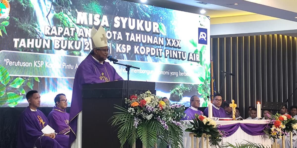 MAUMERE, GardaFlores — Uskup Maumere Mgr. Ewaldus Martinus Sedu menegaskan bahwa kejujuran, solidaritas, dan keberpihakan kepada masyarakat kecil harus menjadi fondasi utama dalam pengelolaan koperasi. Penegasan tersebut disampaikannya saat memimpin Misa Syukur pembukaan Rapat Anggota Tahunan (RAT) Kopdit Pintu Air Tahun Buku 2025 di Auditorium Kantor Pusat Kopdit Pintu Air, Dusun Rotat, Desa Ladogahar, Kecamatan Nita, Kabupaten Sikka, Nusa Tenggara Timur, Kamis (5/3/2026).