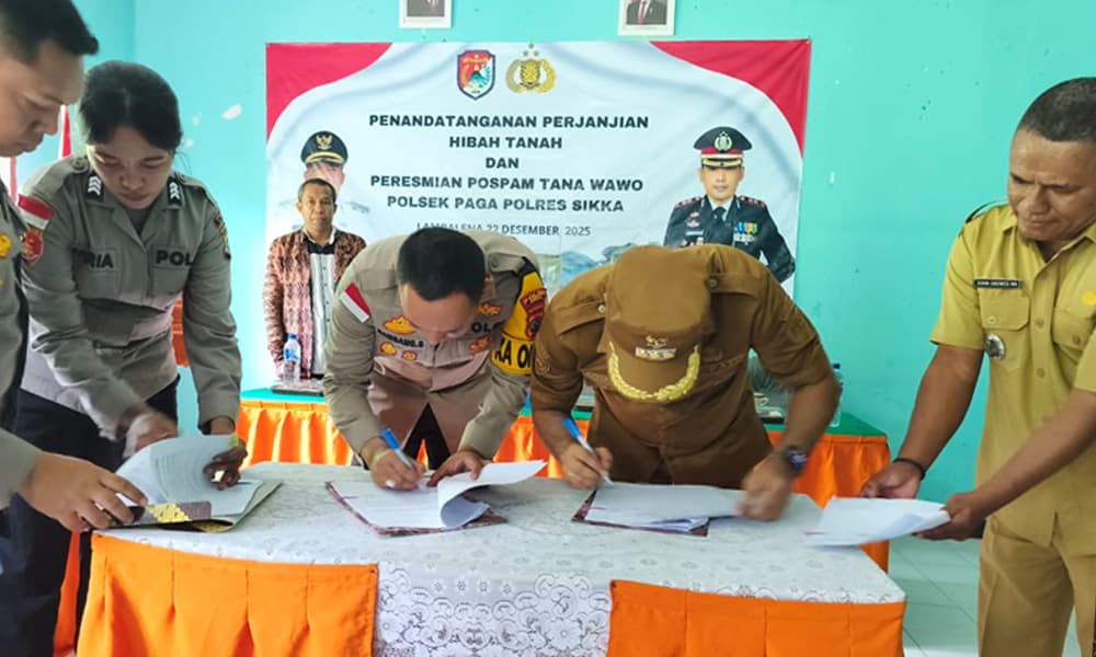 Bupati Sikka dan Kapolres Sikka menandatangani Perjanjian Hibah Tanah sebelum meresmikan Pos Pengamanan (Pospam) Kecamatan Tana Wawo.