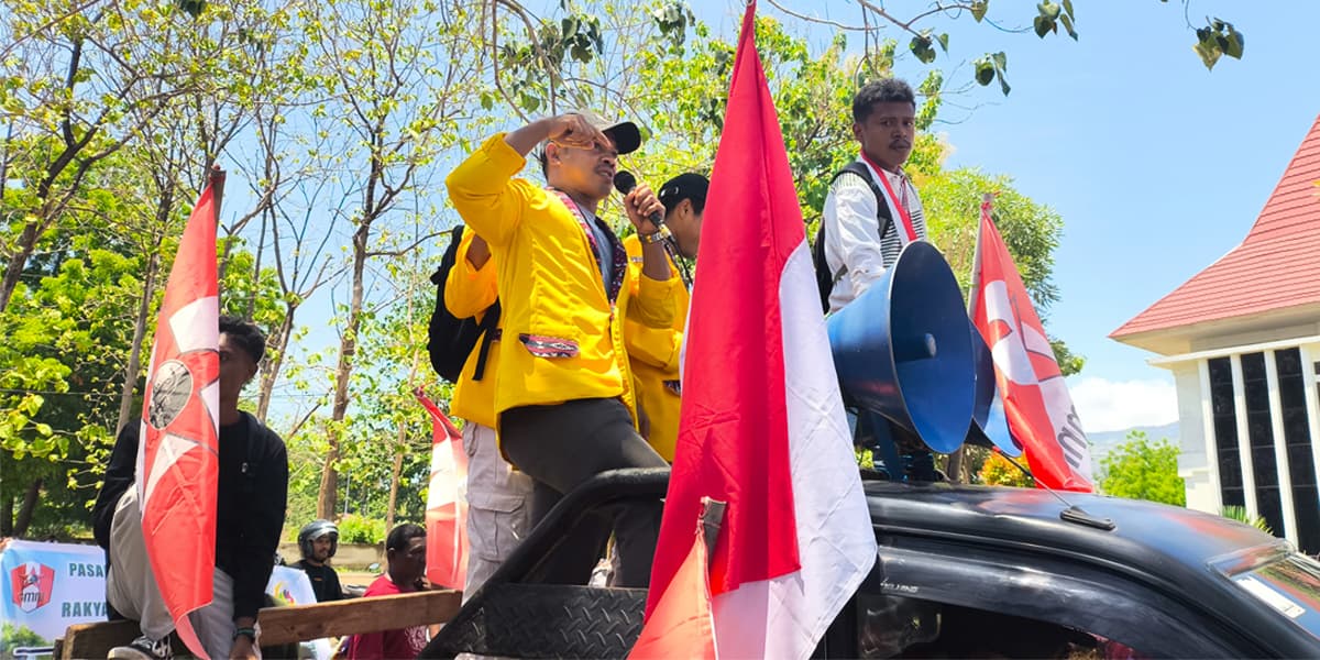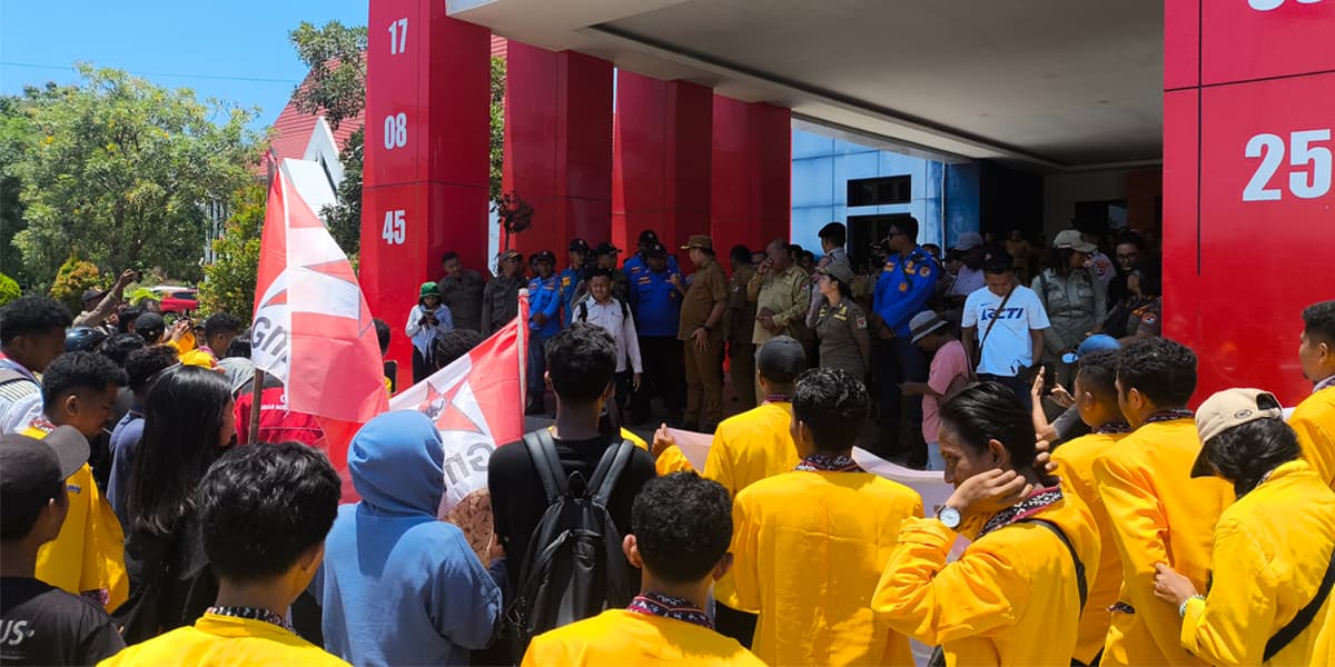 Sedikitnya 30 mahasiswa dari GMNI, HMI, LMND, dan BEM Universitas Nusa Nipa berunjuk rasa meminta pemerintah daerah mengevaluasi prioritas anggaran dan memastikan pemerataan pembangunan. FOTO: GARDAFLORES/KAREL PANDU